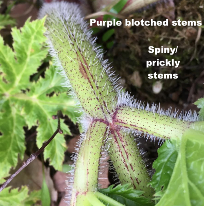 - Stem: Hairy (but not spiny/spiky), grooved, hollow, striated, starting purple (not blotchy), becoming green, new joints and flower buds emerge from papery ‘parcels’. 1.5 to 2 metres (4.5 – 6 feet) tall fully grown.