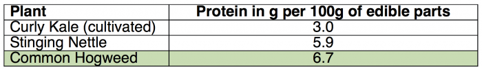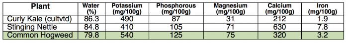 As if their sheer deliciousness isn’t enough, common hogweed is extremely good for you, being packed with minerals, and comparing favourably in lots of departments with other “super foods” – both wild and cultivated.