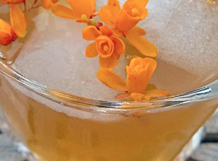 • Bruise a rowan bud and serve on top – the aroma from the bud should enhance the drinking experience. Berberry blossoms are also in season at this time of year, and make a very pretty garnish too.